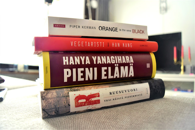 Luin huhtikuussa kuitenkin seuraavia: Piper Kerman: Orange is the new black, Han Kang: Vegetaristi, Hanya Yanagihara: Pieni elämä ja Ruusuvuori: yksi näistä pienemmistä. Koska kirjojen lukemisesta on vierähtänyt tovi, käsittelen nämä nyt vain päällisin puolin.